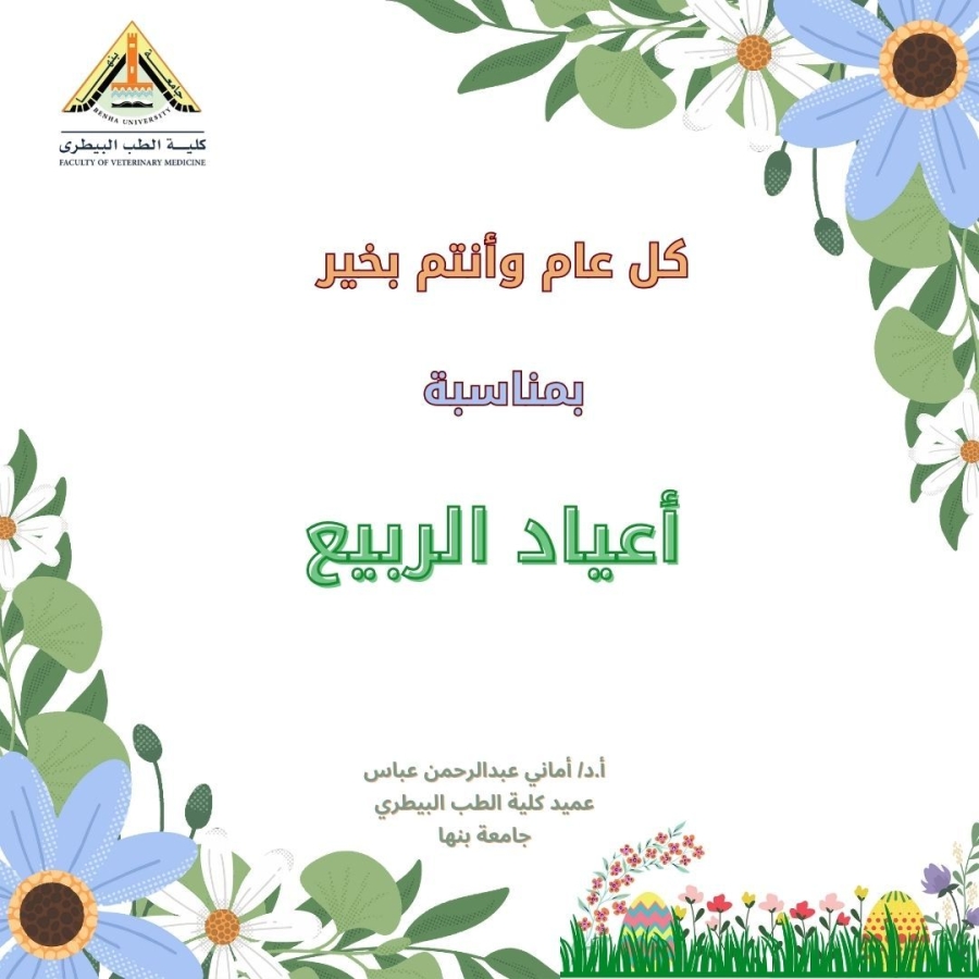 تتقدم الأستاذ الدكتور أماني عبدالرحمن عباس - عميد الكلية بأطيب التهاني للسادة أعضاء هيئة التدريس والهيئة المعاونة والعاملين والطلاب وجميع منتسبي الكلية بمناسبة الإحتفال بأعياد الربيع. وكل عام وحضراتكم بخير