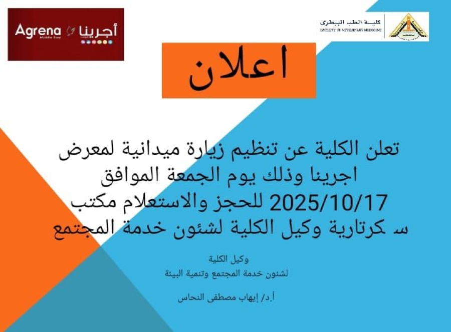 تعلن الكلية عن زيارة ميدانية عن معرض اجرينا وذلك يوم الجمعة 17/10/2025 للحجز ولاستعلام سكرتارية وكيل الكلية لشئون المجتمع وتنمية البيئة